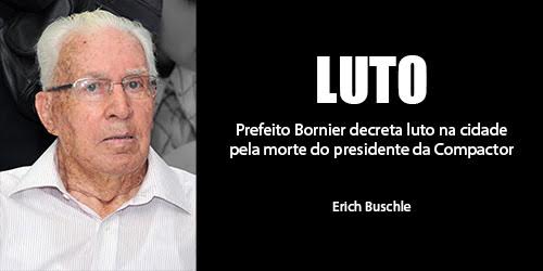 O prefeito de Nova Iguaçu, Nelson Bornier, decretou luto oficial no município por três dias pelo falecimento do Presidente Consultivo da Compactor, Erich Buschle, na manhã de hoje (20). O empresário, nascido na Alemanha, estava com 90 anos de idade e segundo informações de parentes, vinha há alguns anos, sob cuidados médicos. Seu corpo será cremado amanhã às 12h, no Memorial do Carmo, Cemitério do Caju, em cerimônia reservada para os familiares.