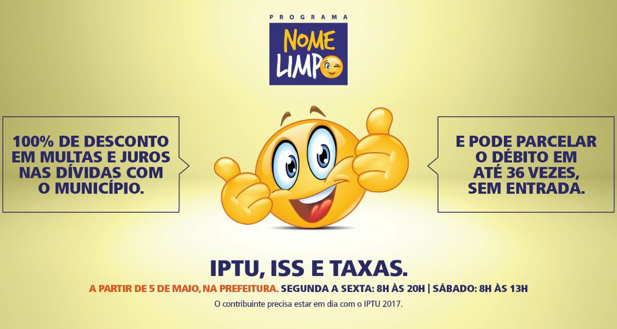 A Prefeitura de Nova Iguaçu inicia, na próxima sexta-feira (05), a campanha Nome Limpo, que dará ao contribuinte o benefício de pagar qualquer dívida – seja ela IPTU, ISS, Auto de Infração e Intimação decorrentes da legislação tributária, de pessoa física ou jurídica – com anistia de 100% de juros e multas, parcelado em até 36 vezes e sem entrada. Para aderir ao programa, basta estar em dia com o Imposto Predial Territorial Urbano (IPTU) de 2017. A primeira parcela deverá ser paga até no dia 09 de junho (data limite).