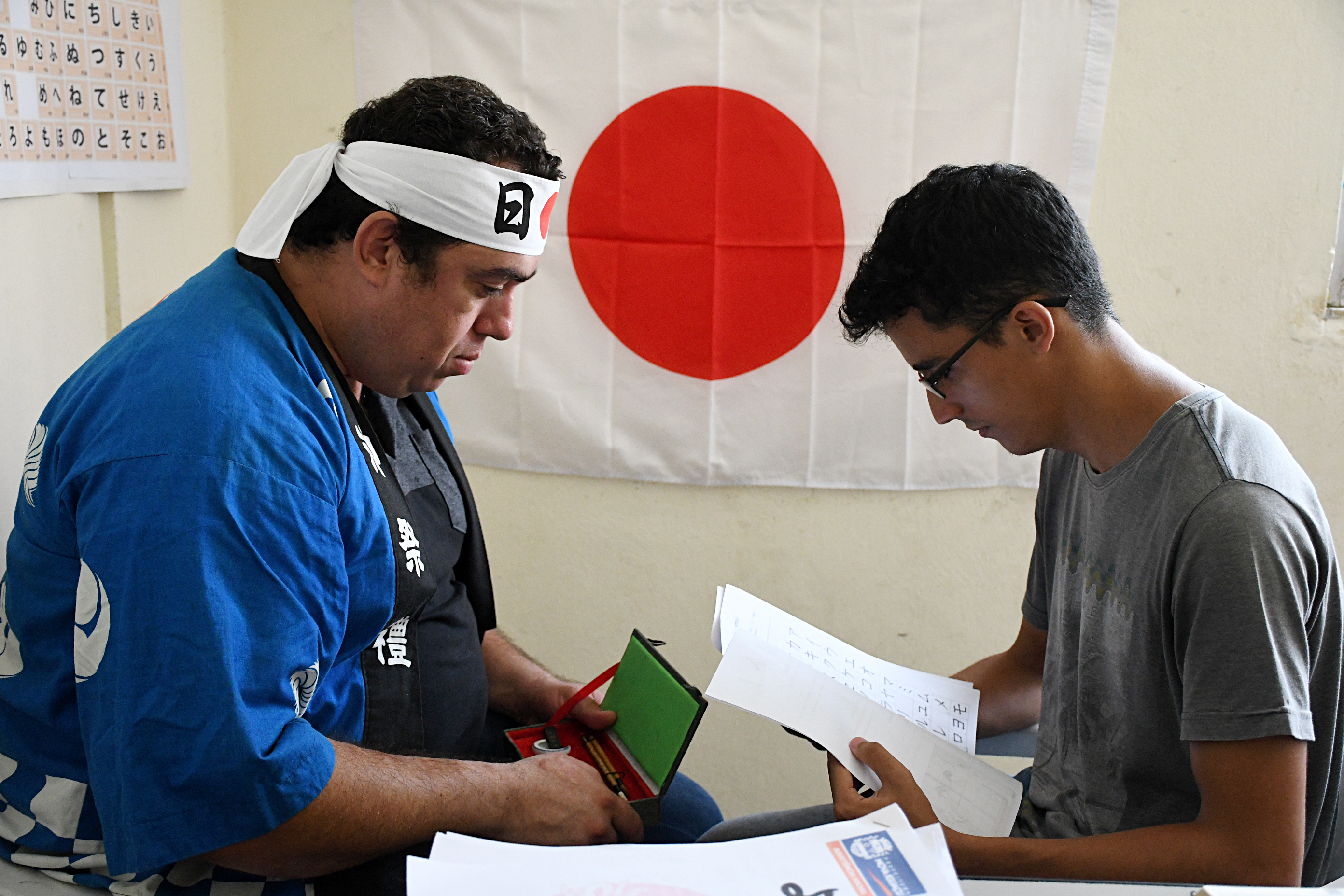 “Meu pai era instrutor de karatê e passei a pegar gosto pelas artes marciais japonesas. As histórias em quadrinhos (mangais) também são uma das minhas paixões. Levo para dentro da sala de aula toda a cultura japonesa. Para falar bem é preciso pelo menos dois anos de curso, mas quero passar ao máximo meu conhecimento e amor por aquele país”, conta Jeferson. As aulas ministradas no Cras Centro e no Esmuti são bem dinâmicas. Além de escrever e falar japonês, os alunos também aprendem o Kandir (escrita chinesa).