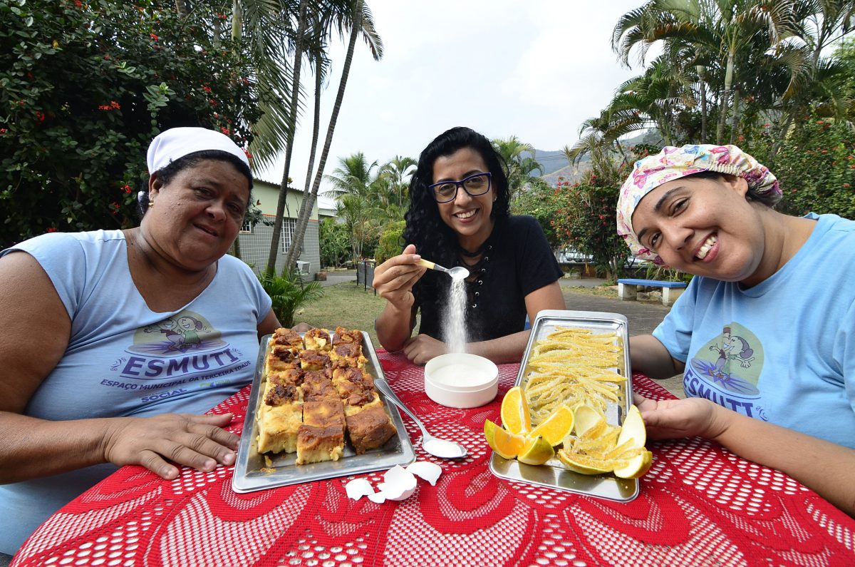 A coordenadora de Segurança Alimentar do Banco de Alimentos Laranjais de Nova Iguaçu, Aline Martins, ao lado das cozinheiras Sandra e Daniele, que prepararam pudim com pão dormido e farinha de casca de ovo e cascas de laranjas cristalizadas