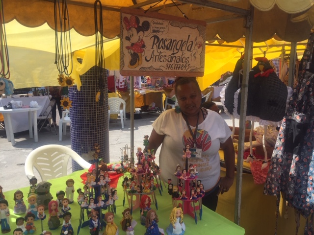 “Quando eu era criança minha mãe fazia tapetes de retalhos e saía para vender, andando de Miguel Couto até Vila de Cava. Naquela época não havia lugar para expor. Era de porta em porta. Agora nós temos feiras onde podemos expor nosso trabalho e ser reconhecidos. Estamos muito felizes”, afirma Rosangela Ribeiro de Carvalho, uma das coordenadoras da Feira de Miguel Couto. Ela faz pinturas em tecido e cria peças em biscuit e EVA (produto em etileno, vinil e acetato).