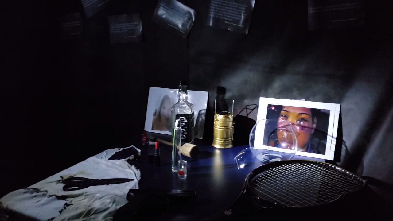 A mostra foi montada em uma sala escura e os visitantes usam uma lanterna para se andar por ela. Dentro dela, um labirinto com camisas brancas com frases de mulheres que vivenciaram a violência doméstica. A última delas, sem nada escrito, mas com manchas de sangue e marcas de tiro, é a que causa o maior impacto no visitante. Há ainda uma mesa com objetos que remetem à violência contra a mulher como, por exemplo, revólver, tesoura, garrafa de vidro, vidro quebrado, esmalte e batom vermelho. Uma voz masculina cita frases de agressores para tornar a experiência ainda mais realista.
