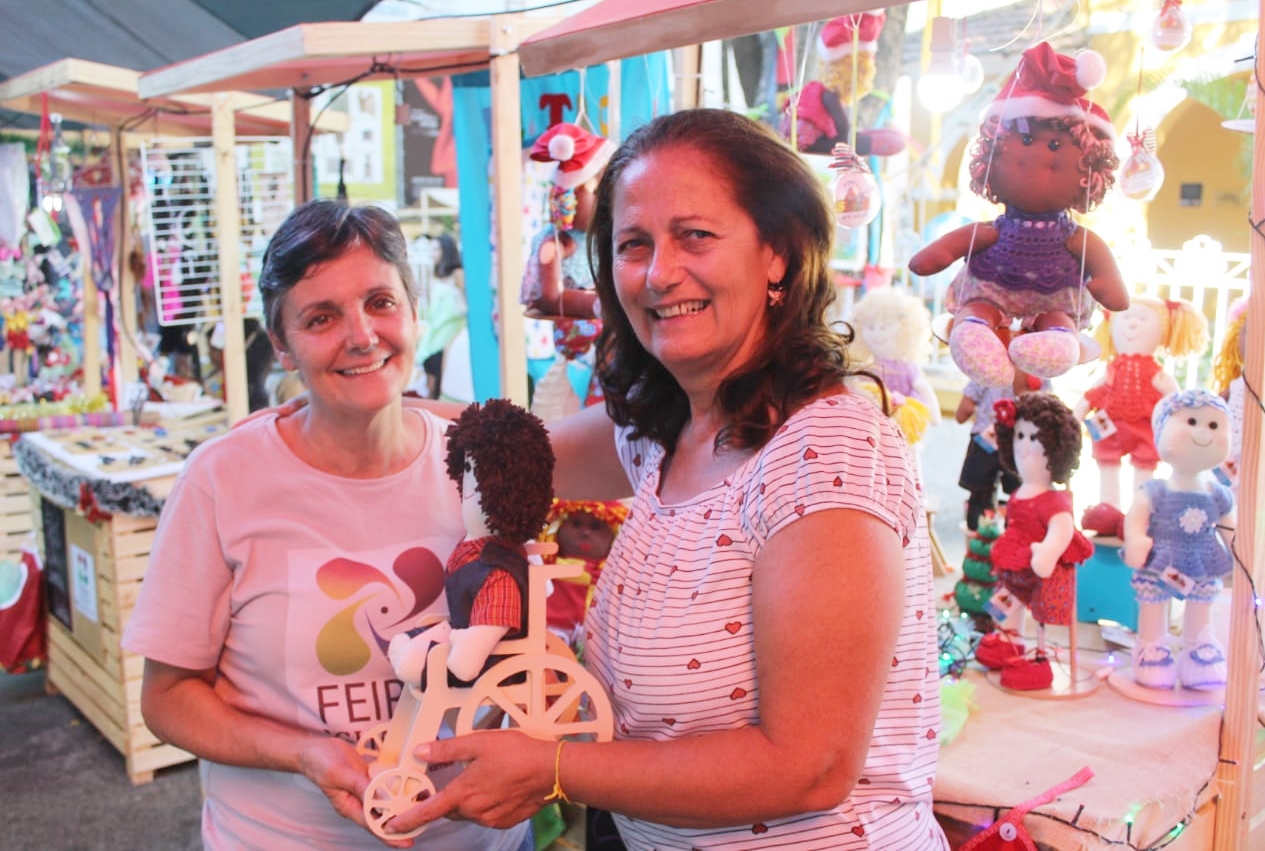Uma das barracas chama a atenção é a de bonecas inclusivas. A expositora Sônia da Silva, de 55 anos, conta que decidiu dar vida a este projeto para mostrar às pessoas que a inclusão é sim, uma solução. “Eu trabalho a inclusão e as diferenças. Vejo isso como uma maneira diferente e acolhedora para as pessoas. Participei, na semana passada, de um evento e saí de lá ainda mais motivada, com muitas ideias. Que 2020 me segure, pois venho com tudo!” garante a artesã, diante de sua coleção com bonecas de todas as cores e jeito que se pode imaginar: bonecas com vitiligo, negras, albinas, cadeirantes, transplantadas, com prótese e Síndrome de Down.