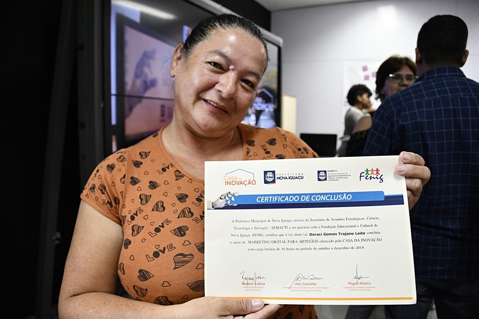 As redes sociais são os novos meios de divulgação do trabalho da artesã Doraci Gomes Trajano Leite, de 49 anos. Durante os últimos dois meses, ela participou do curso de Marketing Digital, oferecido pela Prefeitura de Nova Iguaçu na Casa da Inovação, e descobriu como a internet pode impulsionar as vendas do seu artesanato. Além dela, outras 17 artesãs também fizeram o curso e aprenderam a utilizar mídias digitais como o Facebook e Instagram. A formatura, com entrega de certificados, aconteceu nesta sexta-feira (24), na Casa de Inovação, no Centro. O curso é uma parceria da Fundação Educacional e Cultural de Nova Iguaçu (Fenig) com a Secretaria Municipal de Assuntos Estratégicos, Ciência, Tecnologia e Inovação (Semacti).
