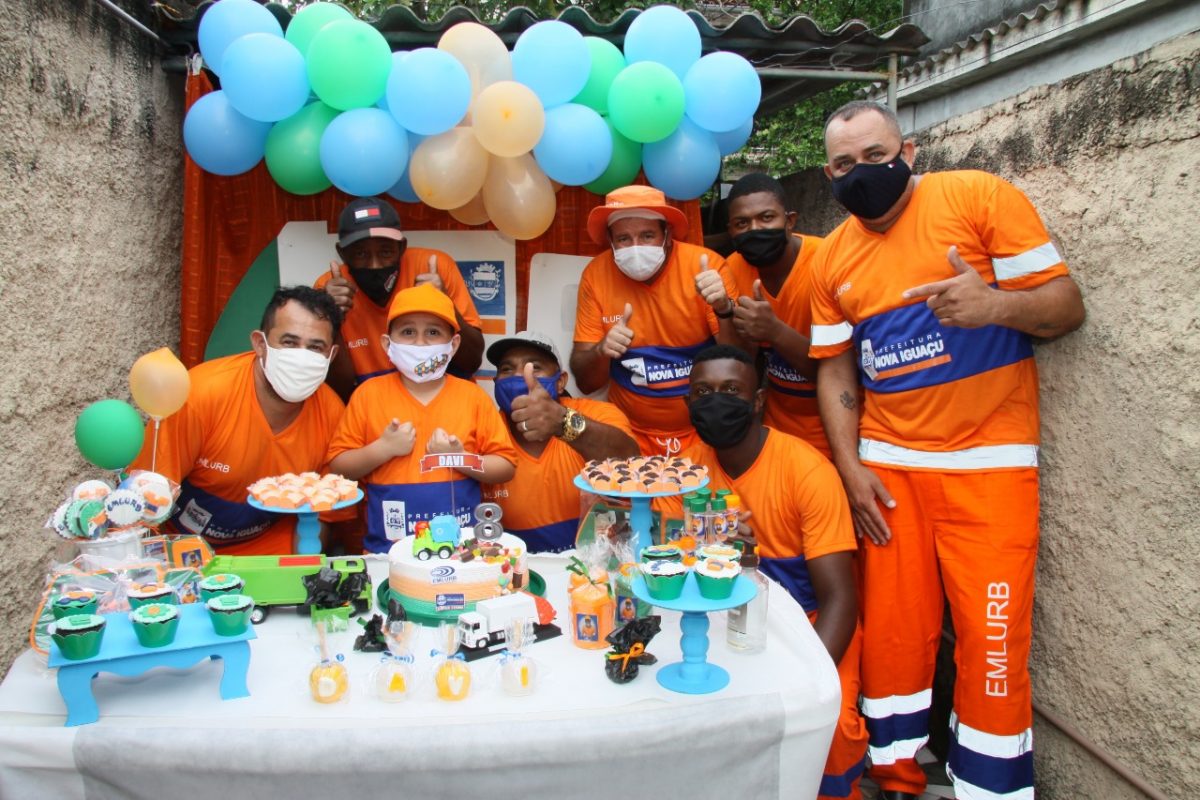 Menino de 8 anos realiza sonho de festa de aniversário com garis de Nova Iguaçu
