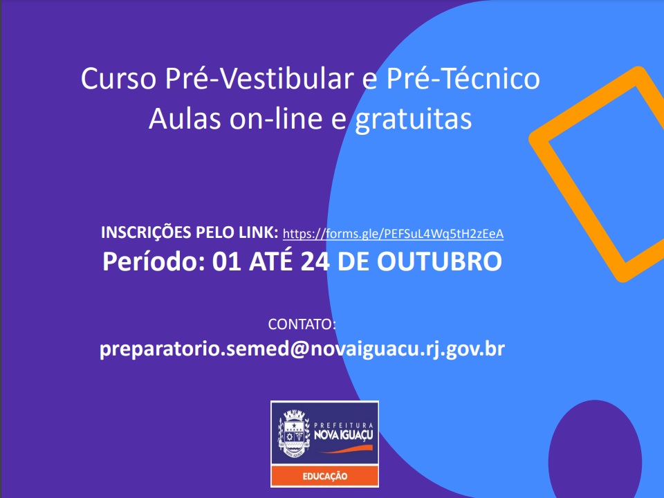 A Prefeitura de Nova Iguaçu vai abrir, nesta sexta-feira (1º), inscrições para o Curso Preparatório Municipal de Nova Iguaçu. Ao todo, 200 vagas serão disponibilizadas para estudantes residentes na cidade que estejam no 9º ano do ensino fundamental ou que tenham concluído o ensino médio. Eles poderão se preparar, de forma gratuita, para os processos seletivos mais importantes do Estado. Os interessados devem se inscrever até o dia 24 de outubro pelo site da Prefeitura: http://www.novaiguacu.rj.gov.br/semed/preparatorio-nova-iguacu/. A ação é desenvolvida pela Secretaria Municipal de Educação (SEMED).