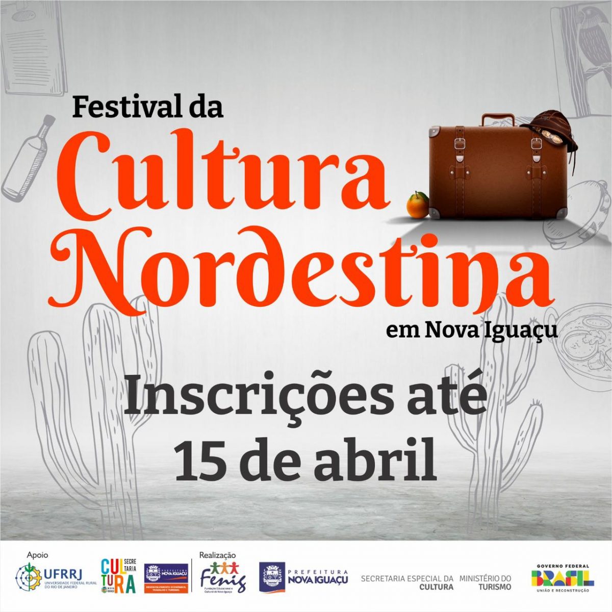 Termina neste sábado (15) o prazo para inscrição no Festival de Cultura Nordestina de Nova Iguaçu. O evento é organizado pela Prefeitura e será realizado no segundo semestre deste ano. Podem se inscrever artistas que desejam fazer apresentações musicais e de dança voltadas para a cultura do Nordeste. Para isto, basta acessar www.novaiguacu.rj.gov.br/fenig/festivaldeculturanordestina/.