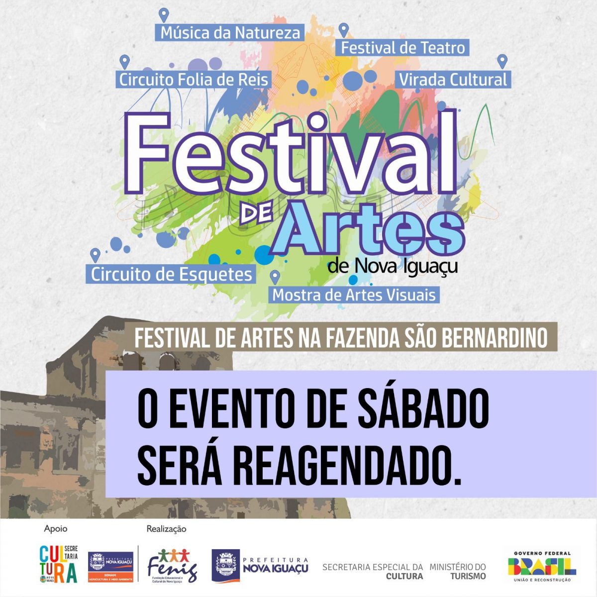 A Prefeitura de Nova Iguaçu informa que, em função da previsão de chuva para este sábado (29), os eventos do Festival de Artes, que seriam realizados na Fazenda São Bernardino, na Estrada Federal de Tinguá, foram adiados. Em breve, a Fundação Educacional e Cultural de Nova Iguaçu (FENIG) irá divulgar a nova data da programação. A programação semanal pode ser consultada em www.novaiguacu.rj.gov.br/fenig/festivaldeartes.