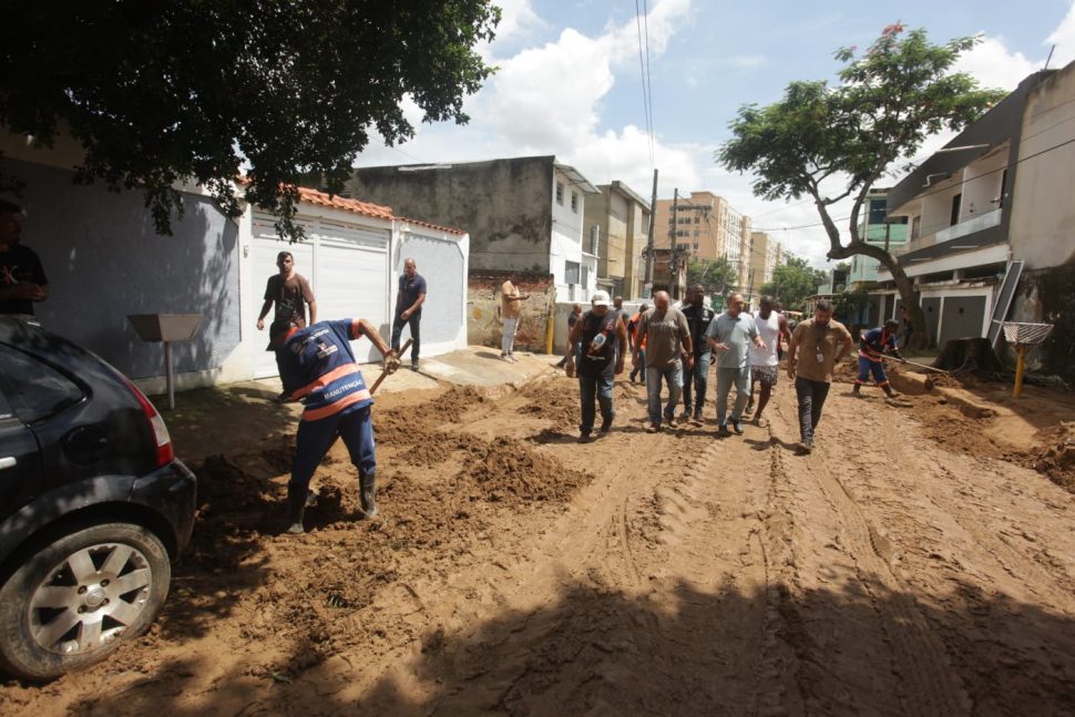 O prefeito acompanhou pessoalmente, ao longo do dia, os trabalhos das equipes nos bairros mais afetados.