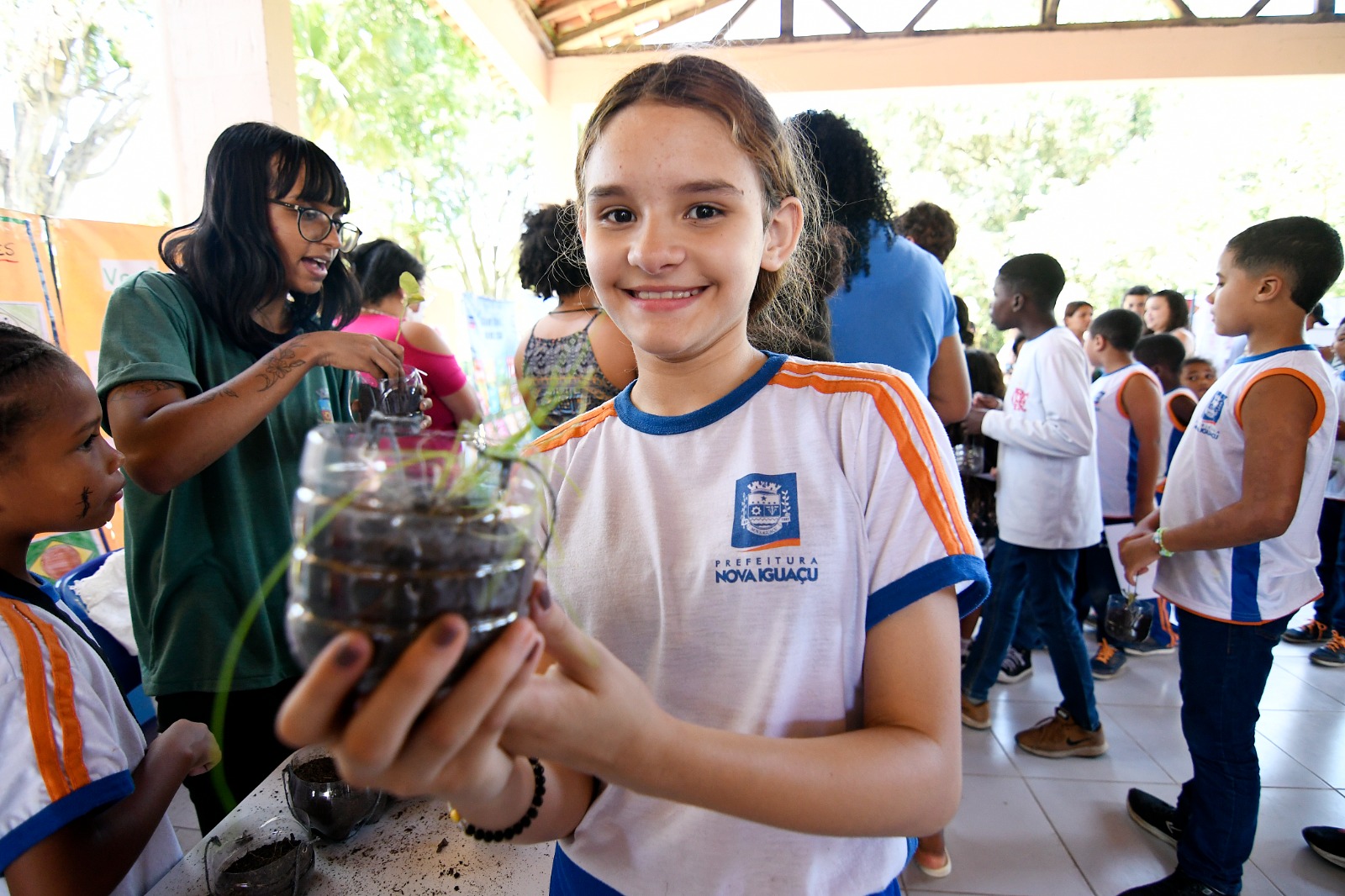 Aluna da Escola Municipal Vale do Tinguá, Victória Xavier da Silva, de 10 anos, levou para casa uma muda de cebolinha para plantar. Ela, que recebeu a planta durante o evento, vai ensinar ao irmão sobre o plantio.