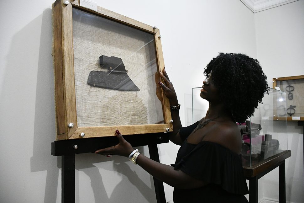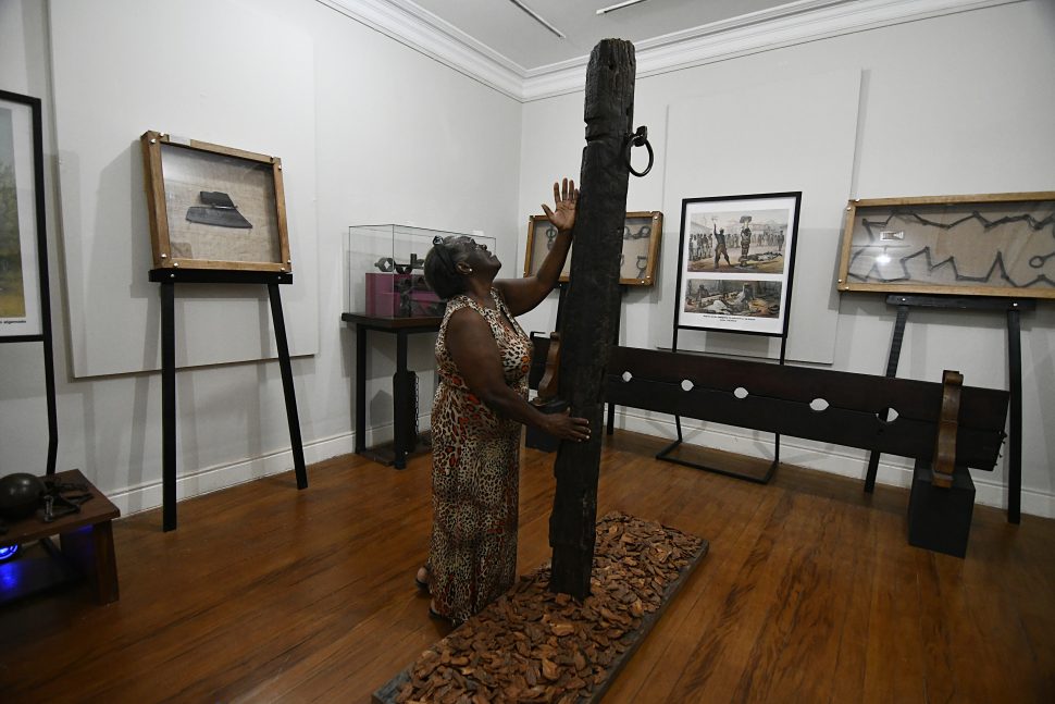 Descendente de família angolana, a assistente social Mônica da Silva Santos, de 46 anos, se emocionou nesta quarta-feira (6) ao visitar as dependências da Casa de Cultura de Nova Iguaçu, que realiza até o dia 31 de janeiro, a exposição: ‘Africanidades na Baixada Fluminense – Contribuição do negro na formação da identidade brasileira’. Ao se deparar com um pelourinho, conhecido como lugar de castigo para criminosos e negros escravizados que eram punidos em locais públicos, além de um açoite, tronco, palmatórias e peias (algemas para os pés), ela chorou.