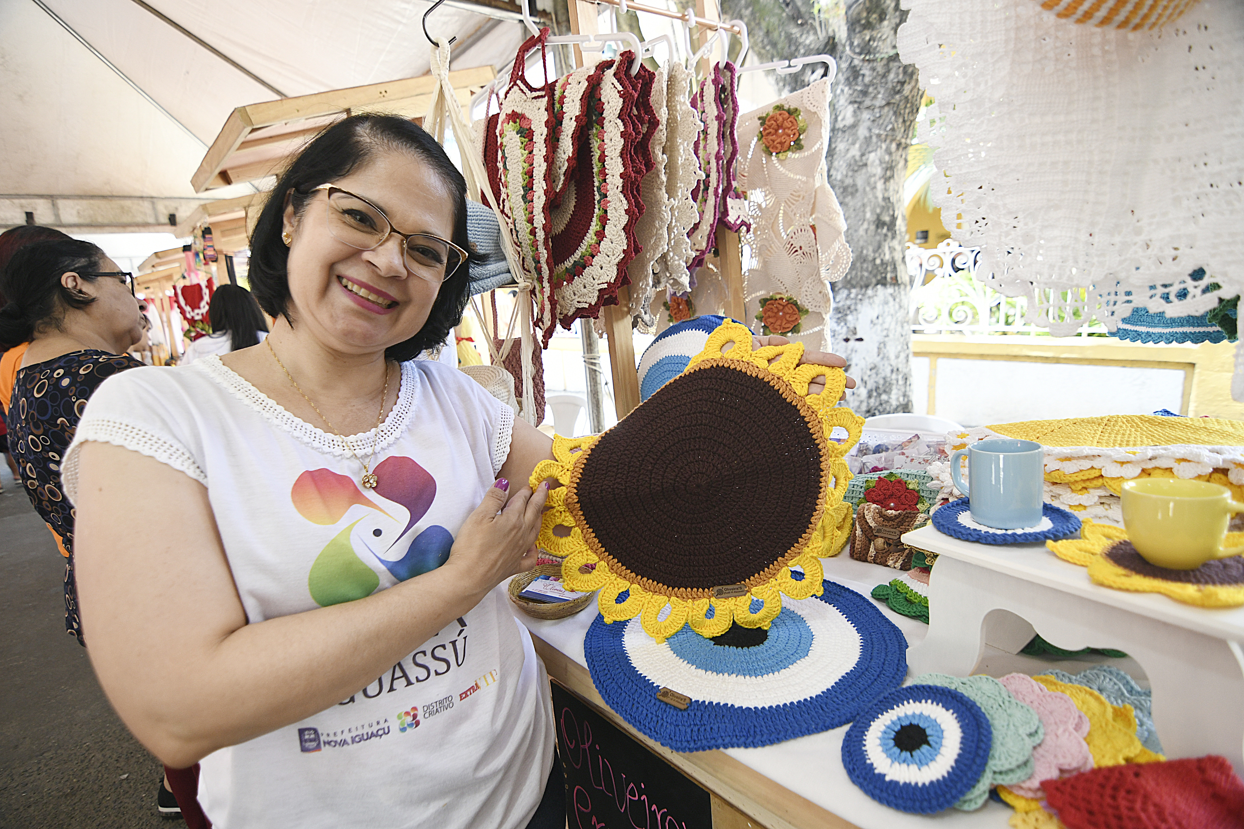 “É uma oportunidade maravilhosa de mostrar nosso trabalho, encontrar amigos que também são artesãos, artistas e fazedores de arte e mostrar o valor da nossa classe para a cidade. Participo sempre”, disse Maria Regina, de 49 anos, moradora de Nova Iguaçu, uma das expositoras da Feira que faz toalhas e outros adereços de crochê.