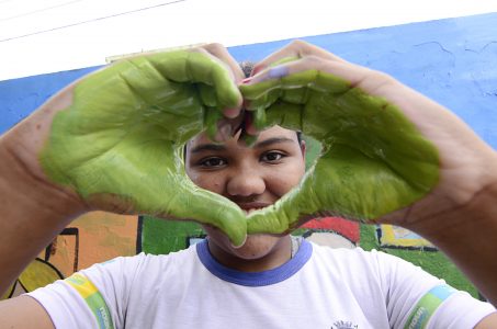 Portador de necessidades especiais, o estudante Uanderson Amaral dos Santos, 16, sujou as mãos de tinta e ajudou a pintar um pedido de paz nos muros da escola.