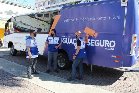 A Prefeitura de Nova Iguaçu, com uma parceria entre as secretarias municipais de Segurança Pública (SEMSEG) e Transporte, Trânsito e Mobilidade Urbana (SEMTMU), iniciou, nesta segunda-feira (25), o Programa Iguaçu Mais Seguro. Um ônibus de monitoramento, estacionado na Praça Rui Barbosa, está auxiliando no patrulhamento ostensivo do centro do município, como no Calçadão, e em diversas outras regiões da cidade. Com tecnologia avançada, o veículo, que funcionará diariamente entre 8h30 às 20h, conta com sete câmeras e três estações de trabalho. O monitoramento será feito por dois agentes de Ordem Pública, policiais do programa “Segurança Presente” e do 20° BPM (Mesquita). Futuramente, esse monitoramento será de 24 horas.