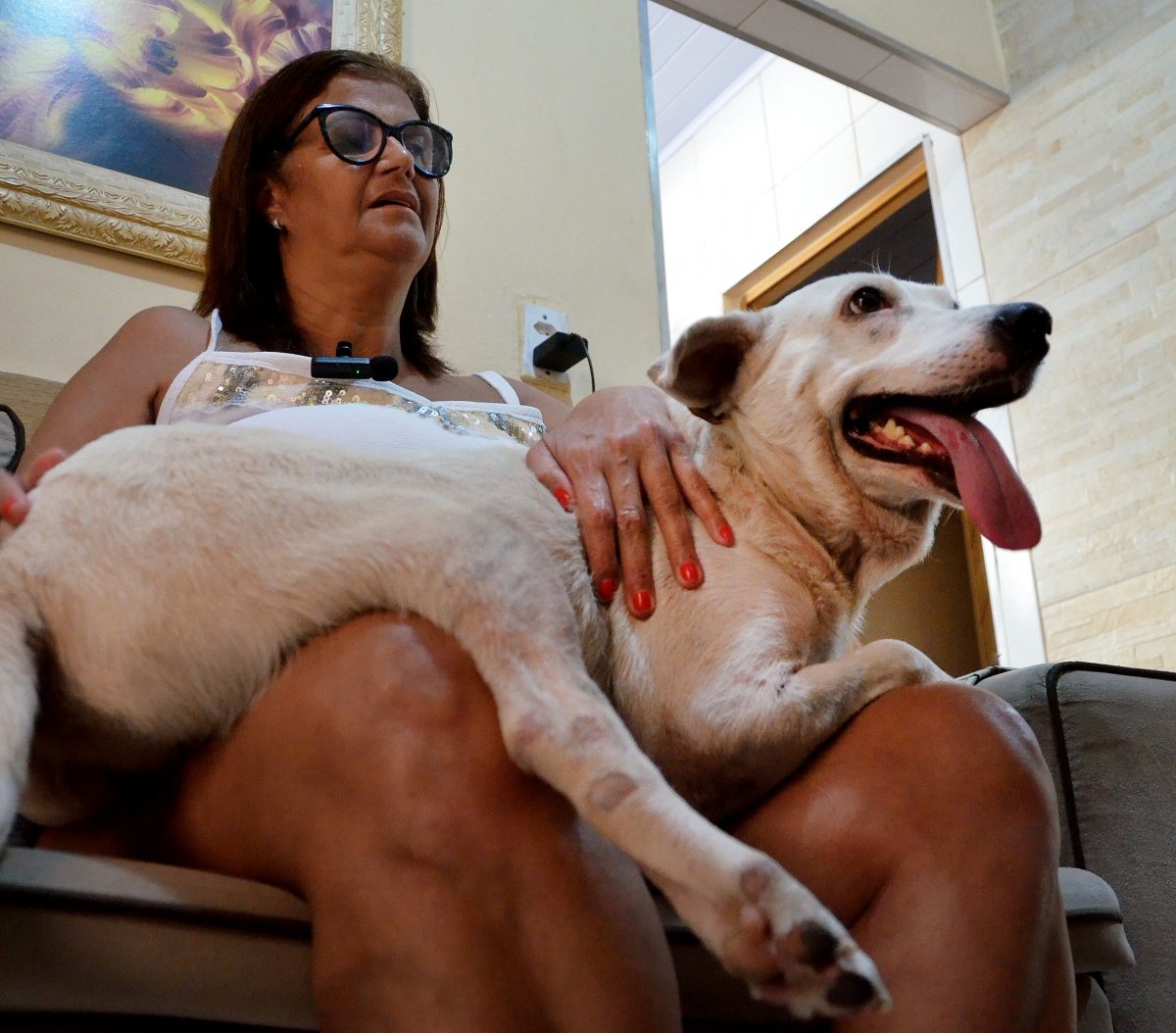 Moradora de Santa Eugênia, a aposentada de 54 anos não resistiu às manhas de Aquiles ao vê-lo na feira. “Quando cheguei perto, ele já deitou e levantou a barriguinha pedindo carinho. Fiquei encantada”, relata Sheila, revelando que, enquanto esteve no shopping, foi e voltou diversas vezes à feira até decidir adotar o cão. “Ninguém queria adotá-lo porque ele tem só três patas. Isso mexeu comigo, pois eu fiz tratamento para lúpus neurológico, passei um tempo sem andar e hoje preciso de muletas”.