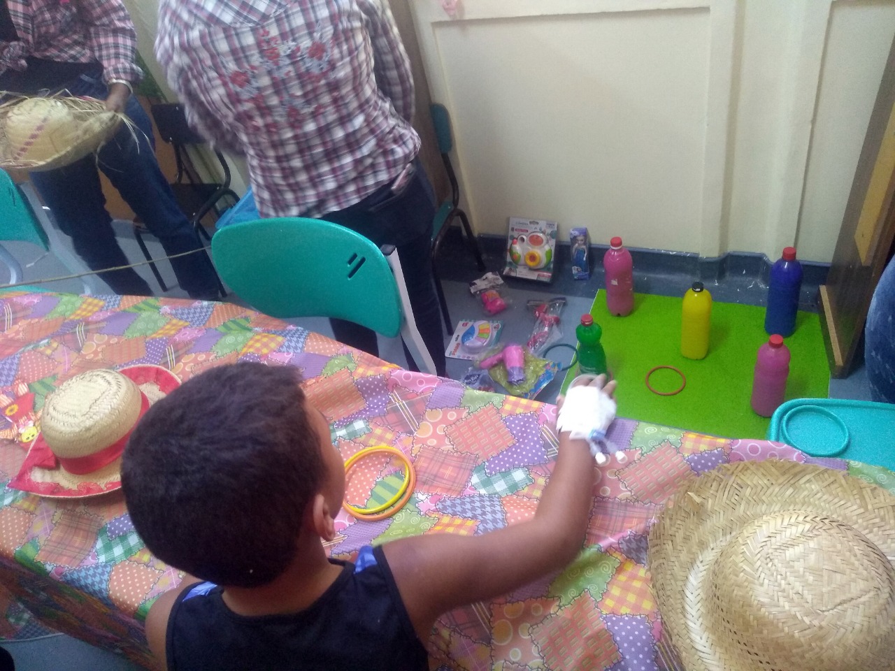 Peterson Gabriel, de três anos, contou com a ajuda da mãe, a dona de casa Débora Oliveira, de 28, para participar das brincadeiras. Os 12 dias de internação do menino no HGNI ficaram em segundo plano, enquanto a família se divertia junta. “Mudou a rotina das crianças e dos pais, que saíram das enfermarias e se divertiram com as atividades criadas pelas professoras para comemorar a festa caipira. A festa foi ótima”, reforça Débora.