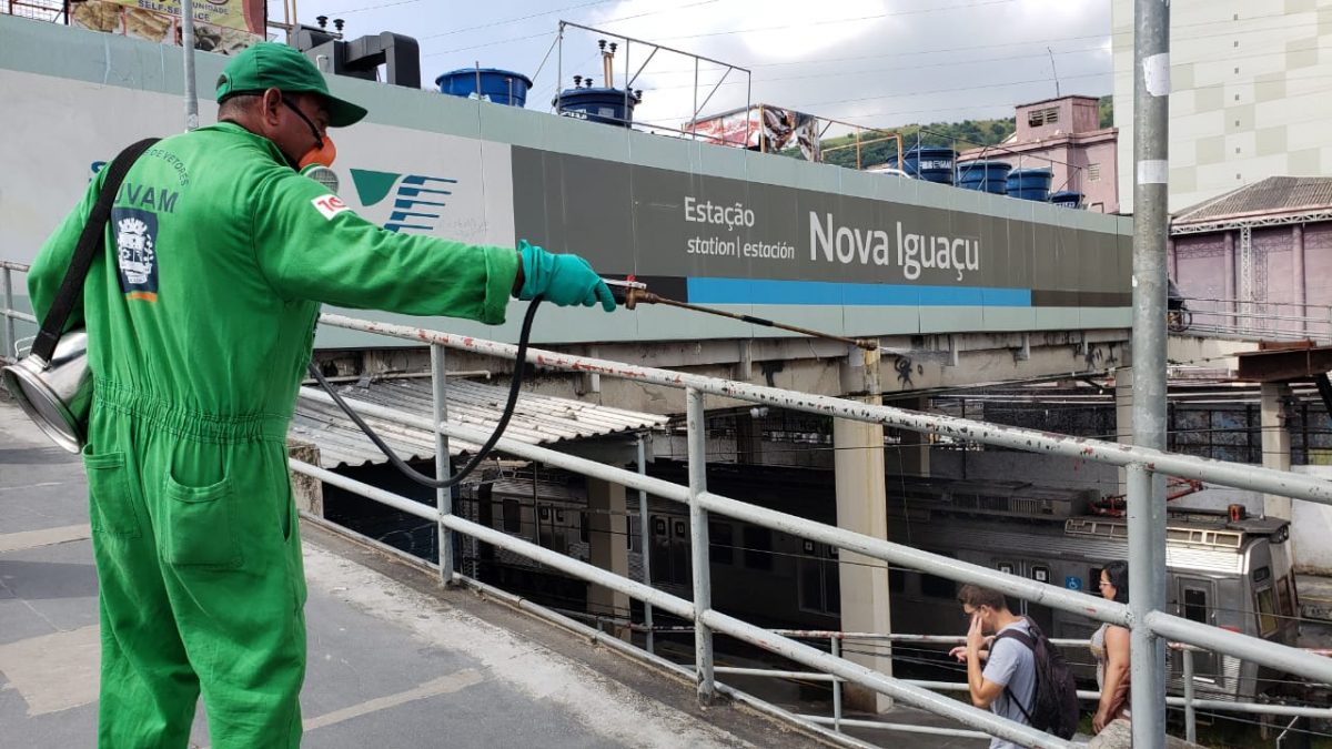 Depois de fazer a descontaminação dos ambientes externos das unidades de saúde do município, a Prefeitura de Nova Iguaçu ampliou o trabalho de reforço da higienização a pontos da cidade onde há maior circulação de pessoas. Nesta terça-feira (31), agentes da Superintendência de Vigilância Ambiental (Suvam), órgão ligado à Secretaria Municipal Saúde (Semus), realizaram o serviço em passarelas, pontos de ônibus, praças, estação de trem e no terminal rodoviário, pulverizando hipoclorito (mistura de água com água sanitária) em corrimãos, paredes e arredores como forma de combater a disseminação da Covid-19.