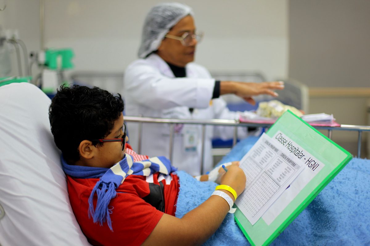 No caso de Luciana dos Santos Andrade, mãe de Lorena Santos Lima, de 7 anos, a Classe Hospitalar é de grande ajuda no desenvolvimento escolar da filha. Internada desde o último dia 5 com pneumonia, a menina está no 2º ano da Escola Municipal Aminthas Pereira e conta os minutos para cada atividade.